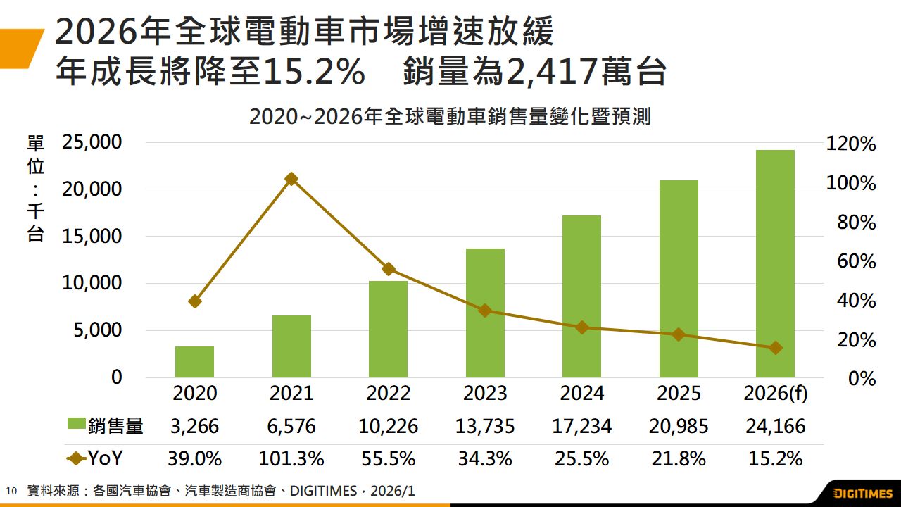 2026年EV动能收敛、全球车市承压 三大市场分化加剧 预估年增15.2%