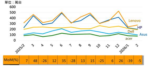 2026/2 NB产业观察:春节期间产能锐减且零组件短缺问题持续 五大NB品牌出货月减5%